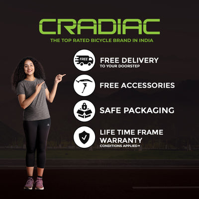 Cradiac Bikes is known for its enduring design, speed & excellent build quality. Cradiac Discover 7 Speed Hybrid bike is assembled on a durable and sturdy 18.5-inch hi-tensile steel frame. Cradiac Discover has Shimano’s Tourney at the rear as derailleurs. SHIMANO SL TX 50 shifters make shifting easy and work reliably for years. With its easy maintenance, this 7-speed bike is perfect for city commuting. Dual disc brakes provide a safe ride in unpredictable weather conditions, heavy traffic, and steep descents. The 700C Nylon tyres and double-wall alloy rims provide considerable grip and control on the road. Commute in style with Cradiac Discover.