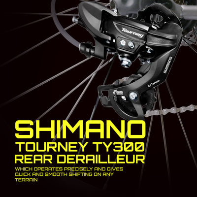 Shimano groupsets are known for their value, quality, and convenience. Shimano 7-speed gears ensure you maintain a steady cadence no matter what the terrain is like. Shimano TY300 at the rear as derailleurs will enhance your riding experience. For an easy shifting process, the bike is fitted with SHIMANO SL TX 50