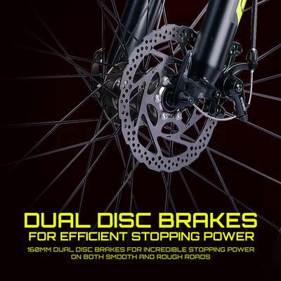 Compared to single-wall rims, double-wall alloy rims are sturdier and more resistant to damage. Single-wall rims are not suitable for off-road riding due to the increased risk of wheel damage and it has a much shorter lifespan than double-wall rims. The bike also has dual disc brakes for powerful braking. It generates more braking power than standard brakes and helps you ride confidently on different trails.