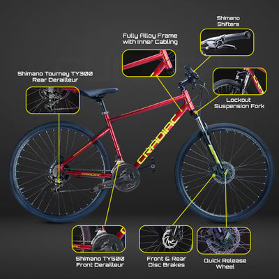 Cradiac Bikes is known for its enduring design, speed & excellent build quality. Cradiac Gunner Rigid 21 Speed Hybrid bike is assembled on a durable and sturdy 18.5 inch alloy frame. Cradiac Gunner Rigid has Shimano groupset at the front and rear as derailleurs. Shimano EF500 shifters make shifting easy and work reliably for years.